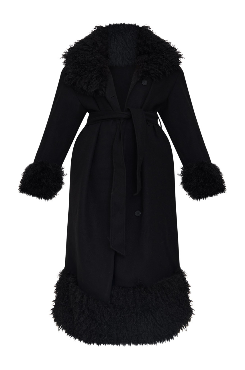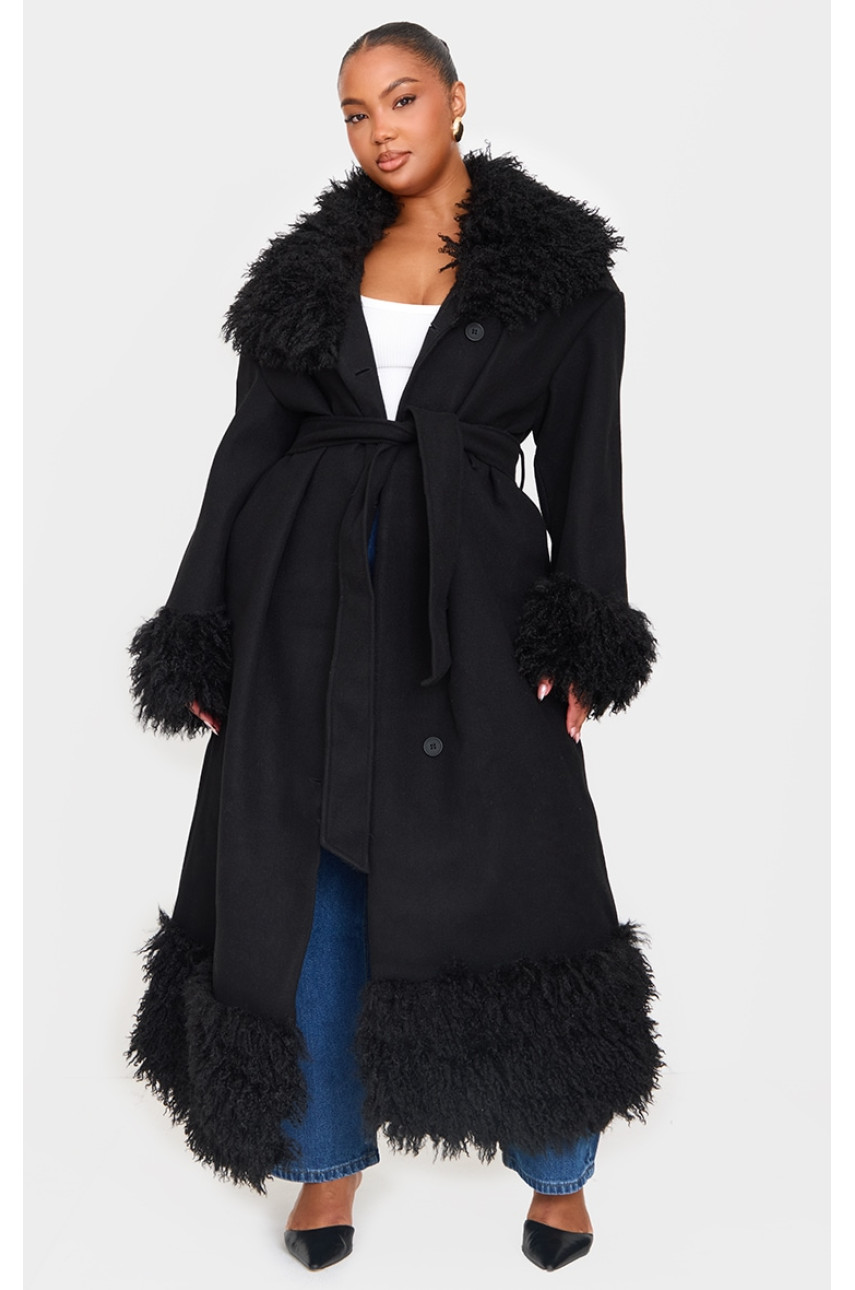 Плюс чорне пальто з контрастною вовняною обробкою зі штучного хутра