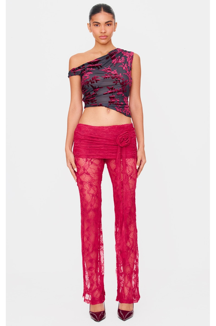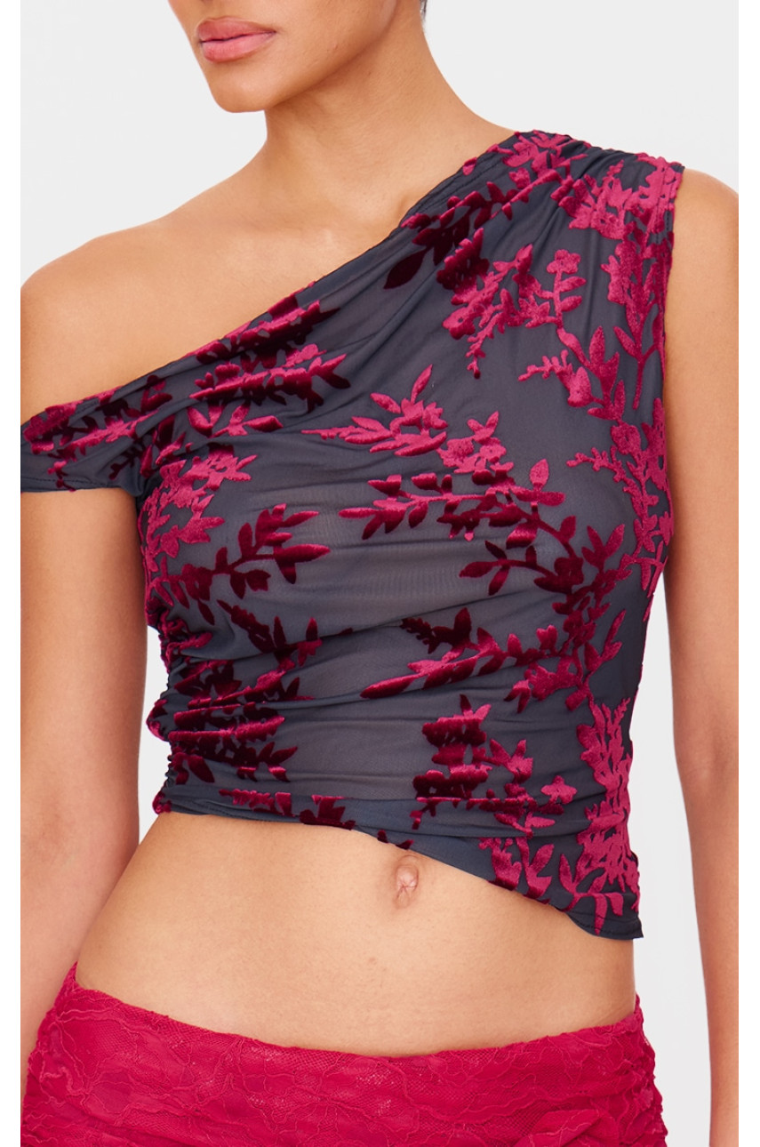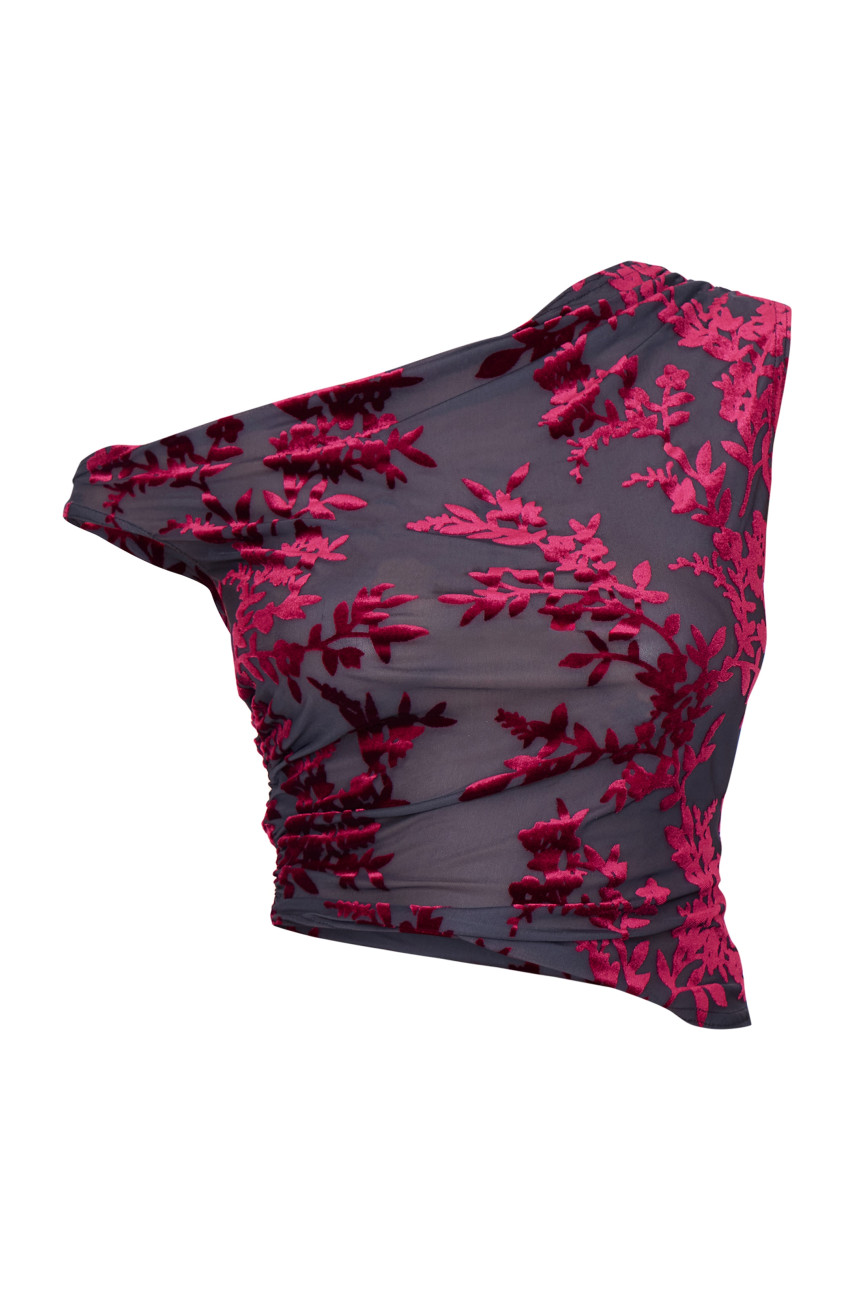 Асиметричний довгий топ з квітковими деталями бордового кольору Devore