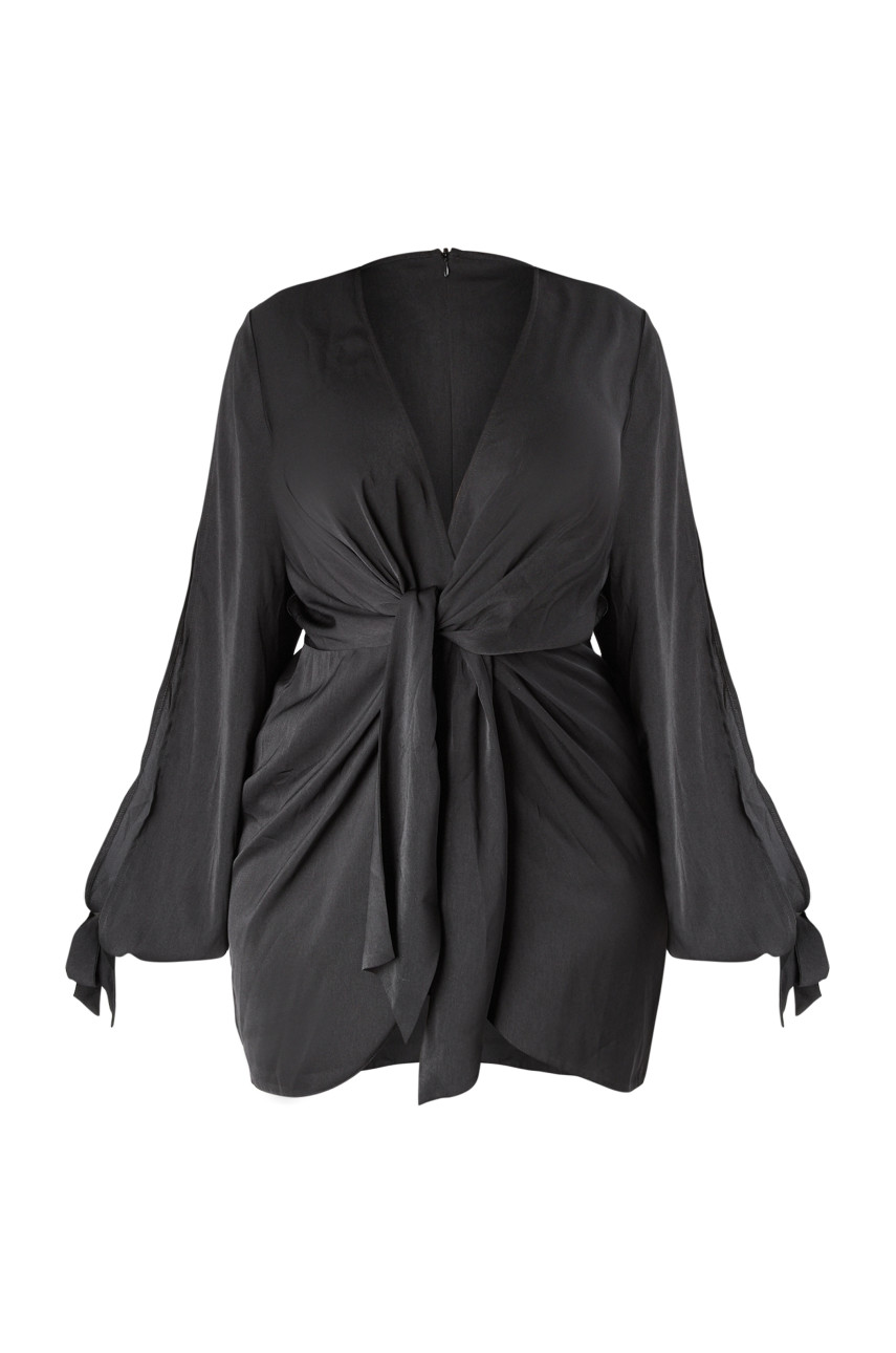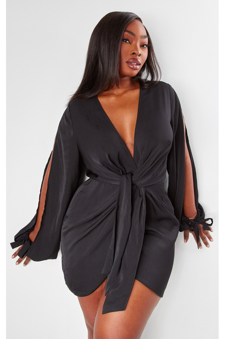 Додаткова чорна атласна сукня з відкритими рукавами і закруткою спереду
