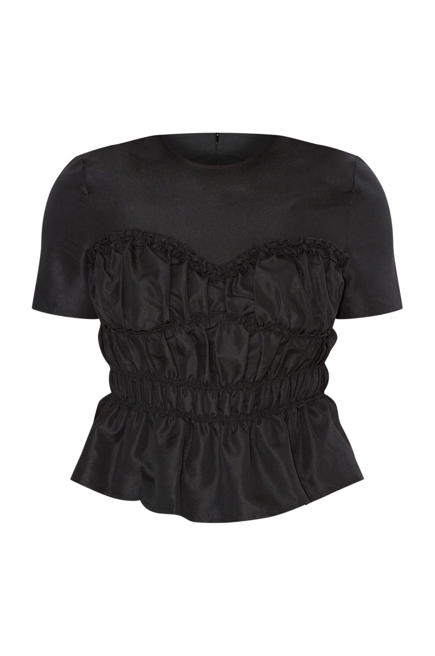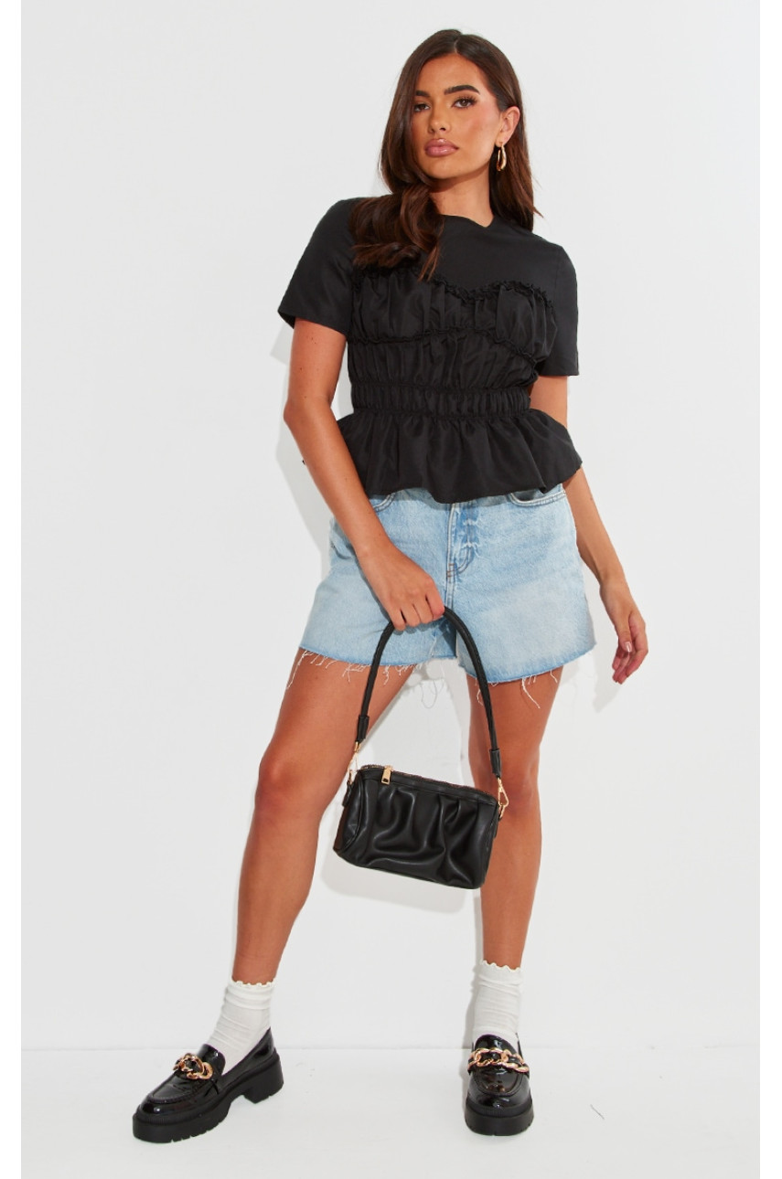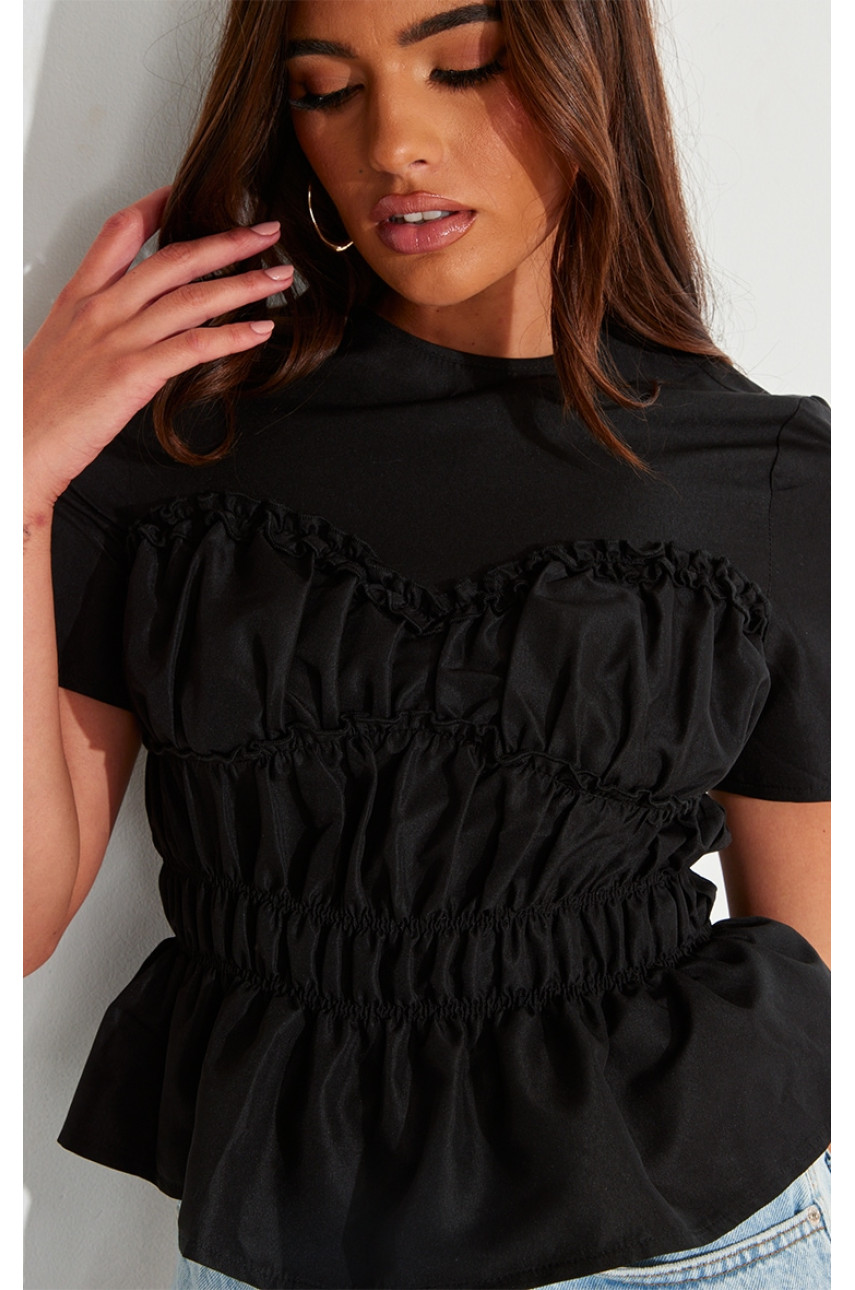 Довгий топ у стилі чорної плетеної футболки з рюшами