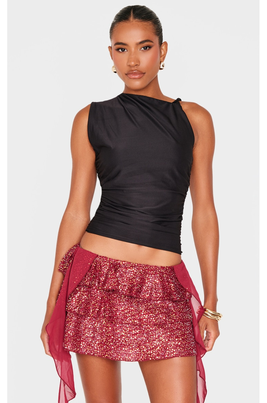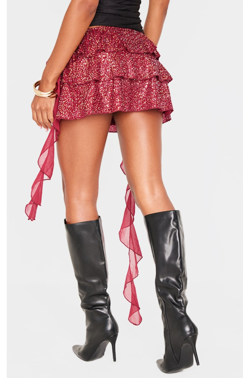 Будьте в центрі уваги з цією бордовою міні-спідницею з оборками і паєтками. Представлено вам у бордовому матеріалі з оборками з паєток і драпіруванням, що додає нотку розкоші, як ніхто інший. Поєднайте цю міні-спідницю з коротким топом і парою підборів, щоб завершити образ, який приверне вашу увагу. Довжина приблизно 33 см/13 дюймів (на основі розміру вибірки UK 8) На моделі одягнено розмір UK 8/ EU 36/ AUS 8/ US 4. Зріст моделі — 5 футів 10 дюймів. Категорія: низ. Тип продукту: міні-спідниця. Колір: бордовий.