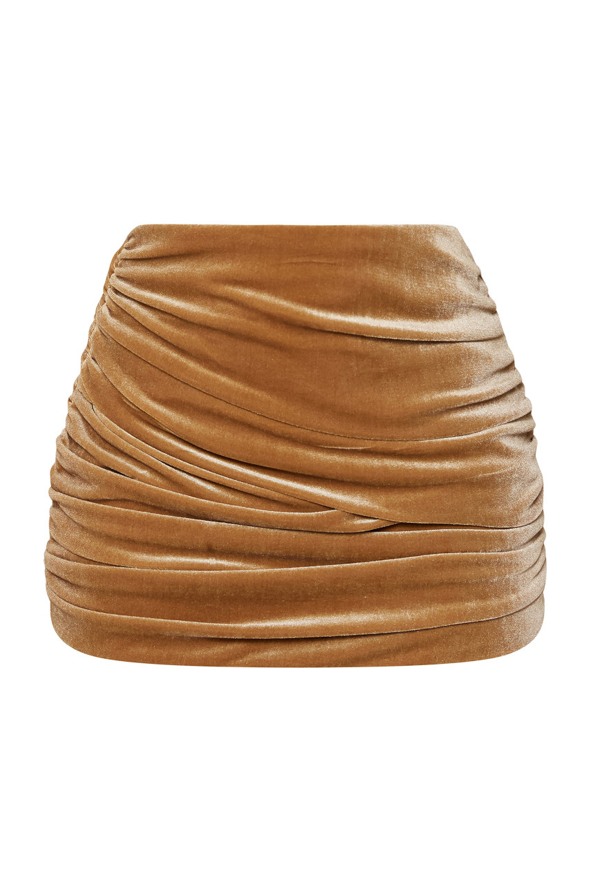 Золотисто-оливкова оксамитова міні-спідниця з рюшами